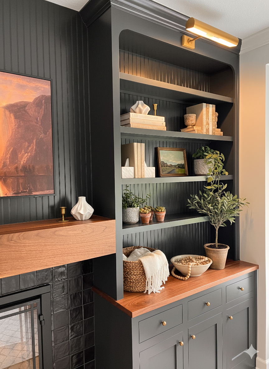 Elegant built-in cabinetry featuring a dark painted finish, natural wood countertop, and brass hardware. Open shelving styled with books, artwork, and greenery creates a refined, timeless look for a sophisticated living space.